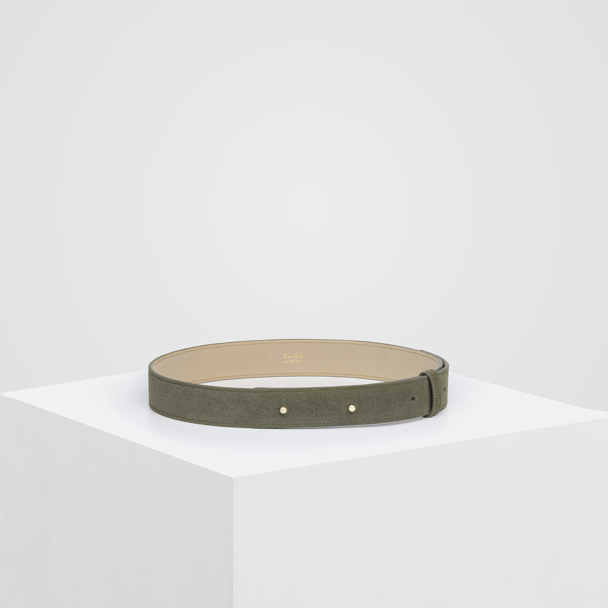 Cinto em pele de camurça verde.Acabamentos metálicos dourados.Ajustável em 3 tamanhos.Orgulhosamente produzido em Portugal.