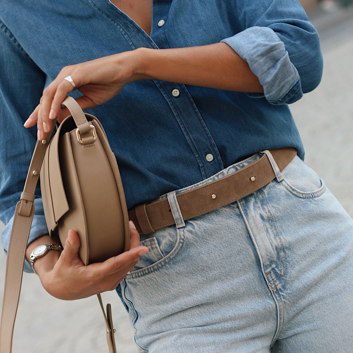 Cinto em pele de camurça bege acastanhado.Acabamentos metálicos dourados.Ajustável em 3 tamanhos.Orgulhosamente produzido em Portugal.