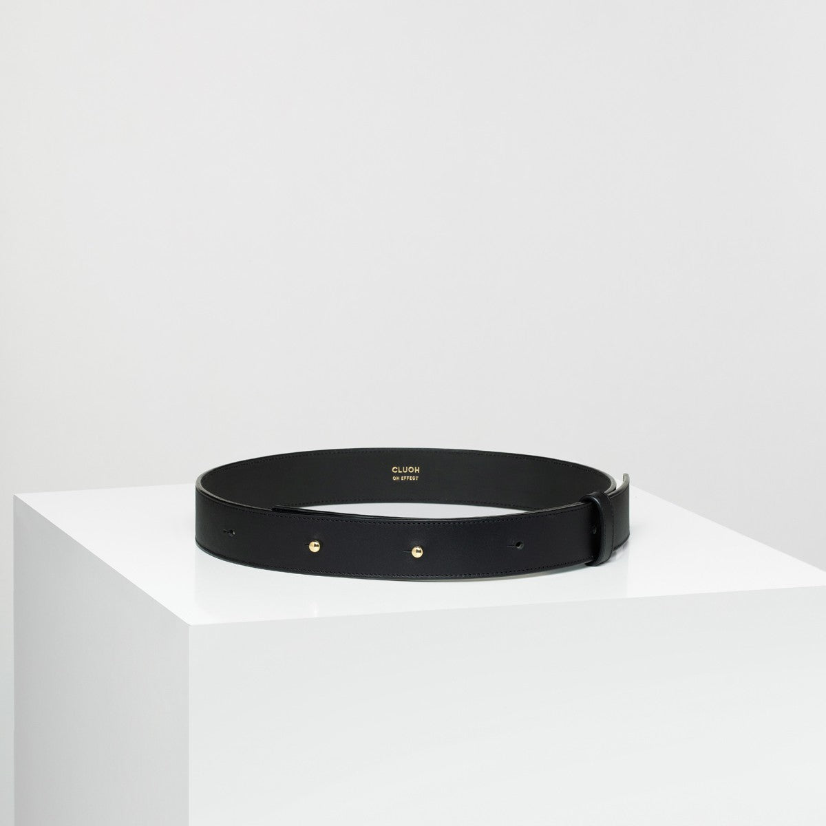 Cinto em pele preta.Acabamentos metálicos dourados, disponível em 2 tamanhos.Orgulhosamente produzido em Portugal.