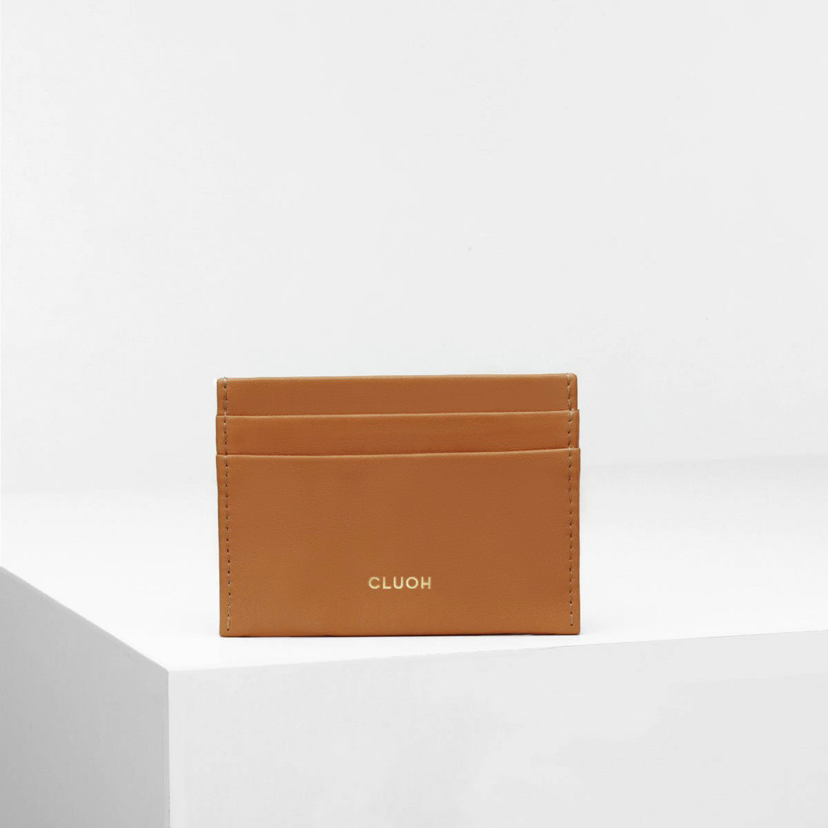 Porta-cartões em pele camel com logo prateado. 4 ranhuras, cada ranhura dá para 2 a...