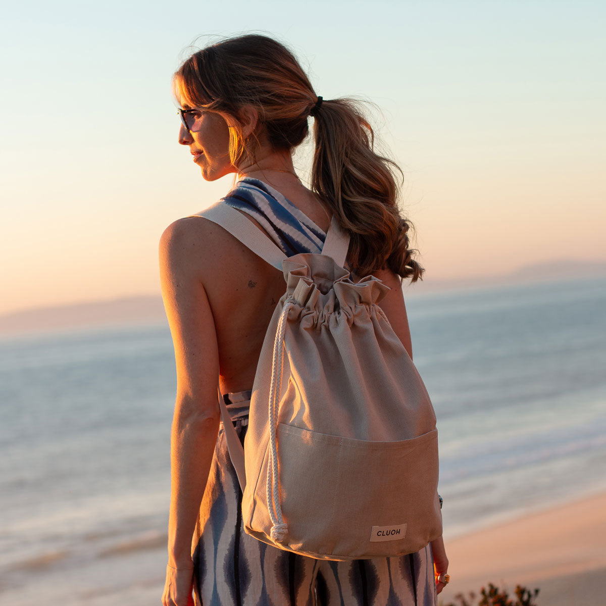 Backpack with oval base and drawstring closure system. 3 exterior pockets and 1 interior pocket....