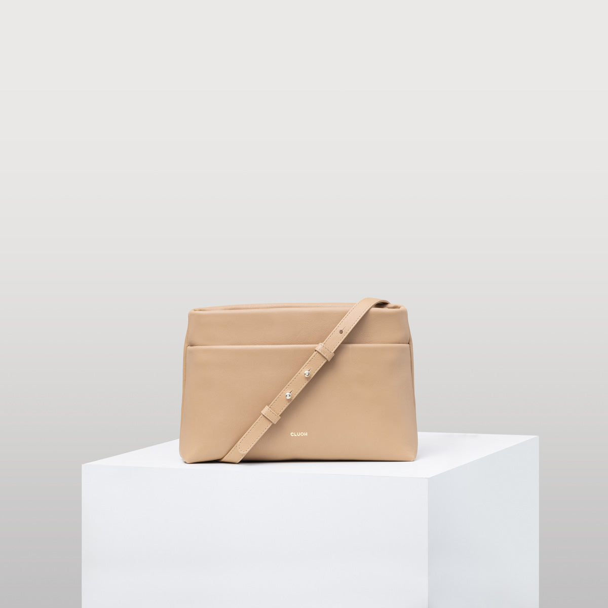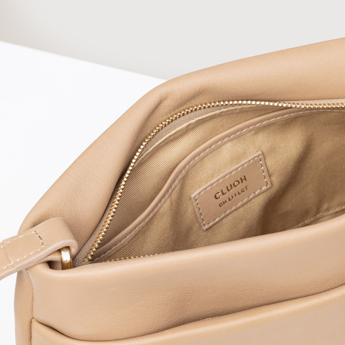 Croissant leather bag with interior and exterior pockets.