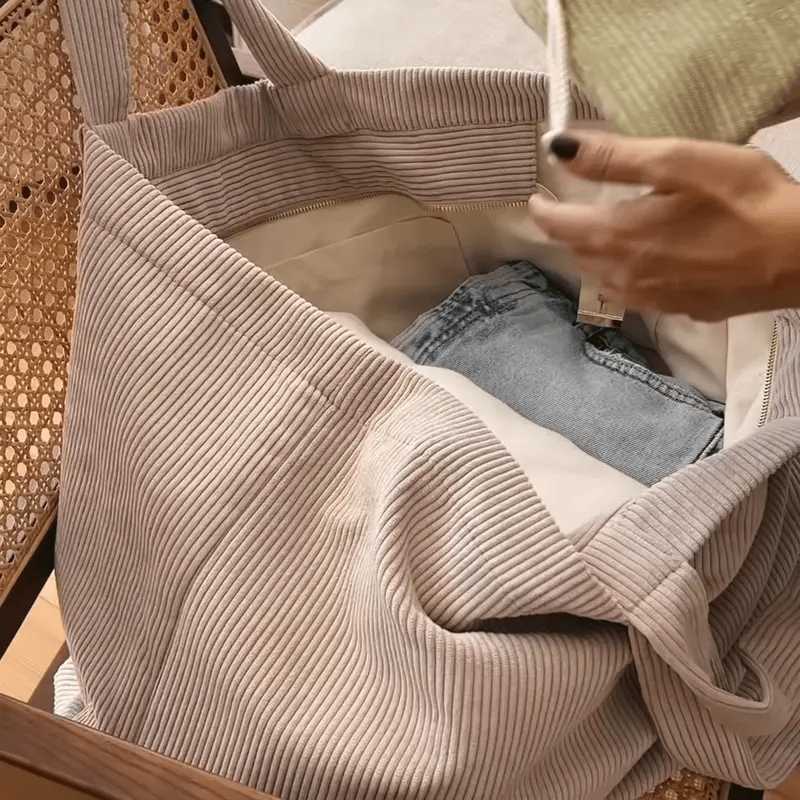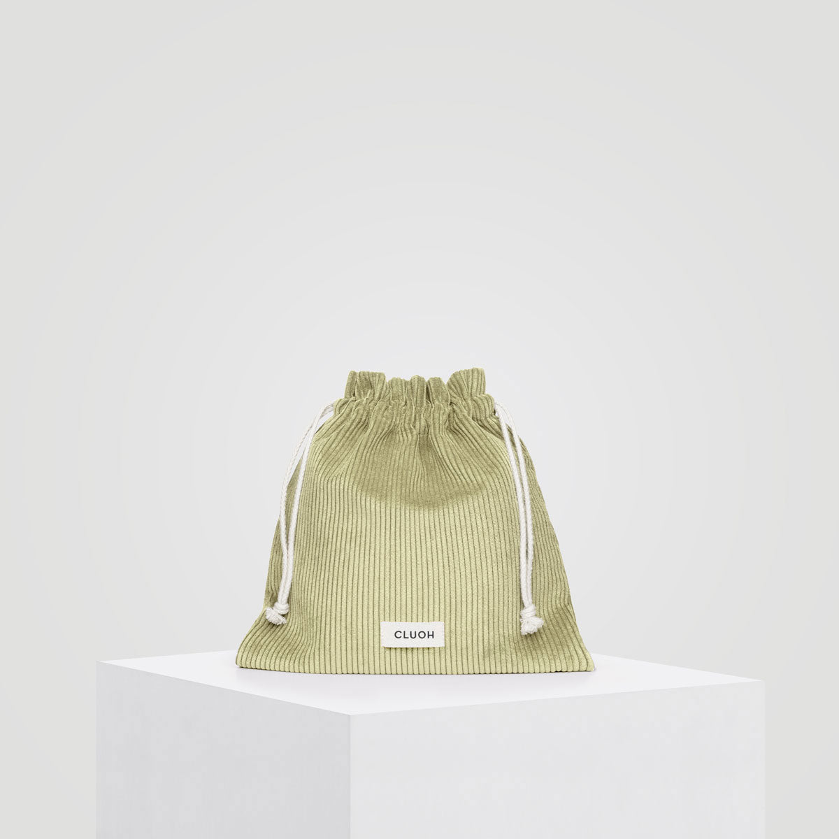 Bolsa em bombazine com forro e sistema de fecho em cordão.