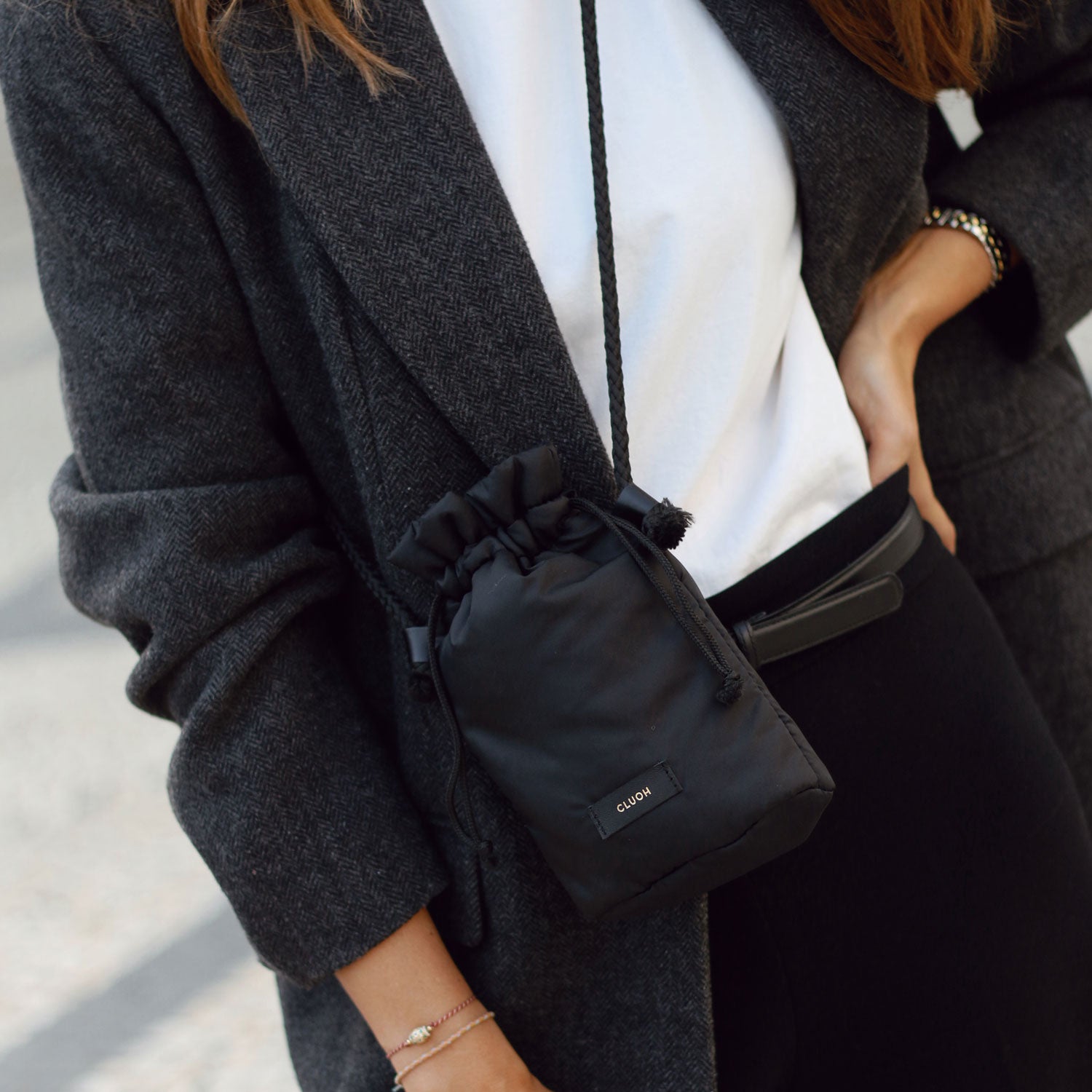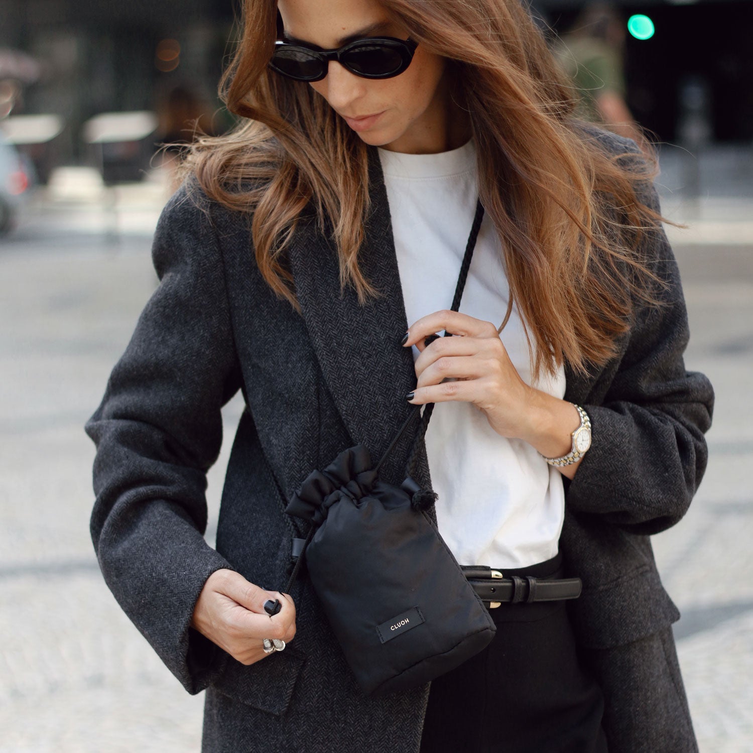 Mini mala em nylon impermeável com sistema de fecho em cordão e alça tiracolo.