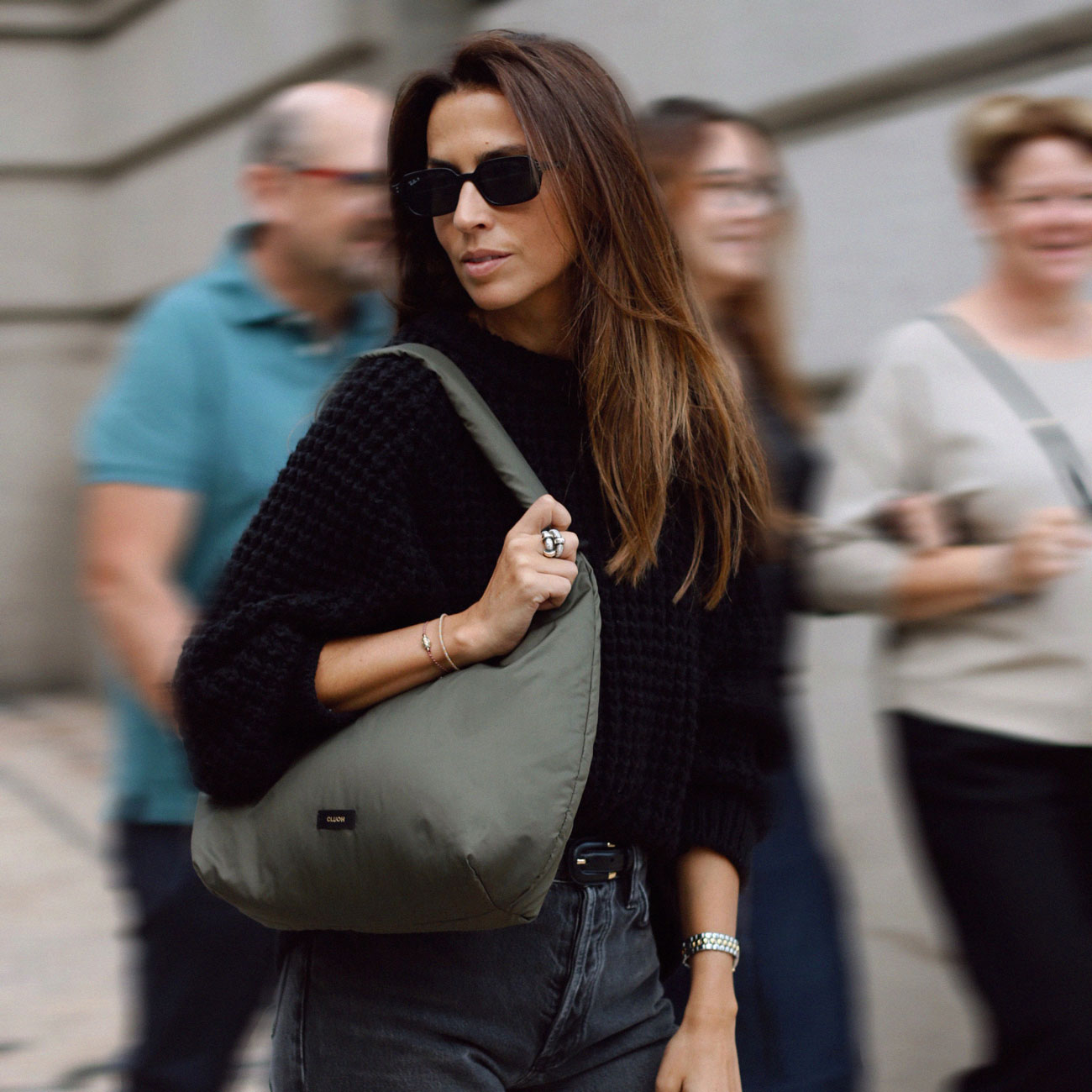 Carteira de ombro em nylon impermeável com fecho zíper e bolso interior.