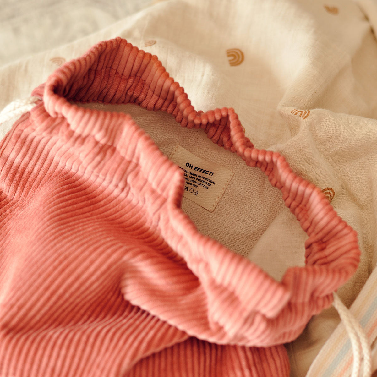 Bolsa em bombazine com forro e sistema de fecho em cordão.