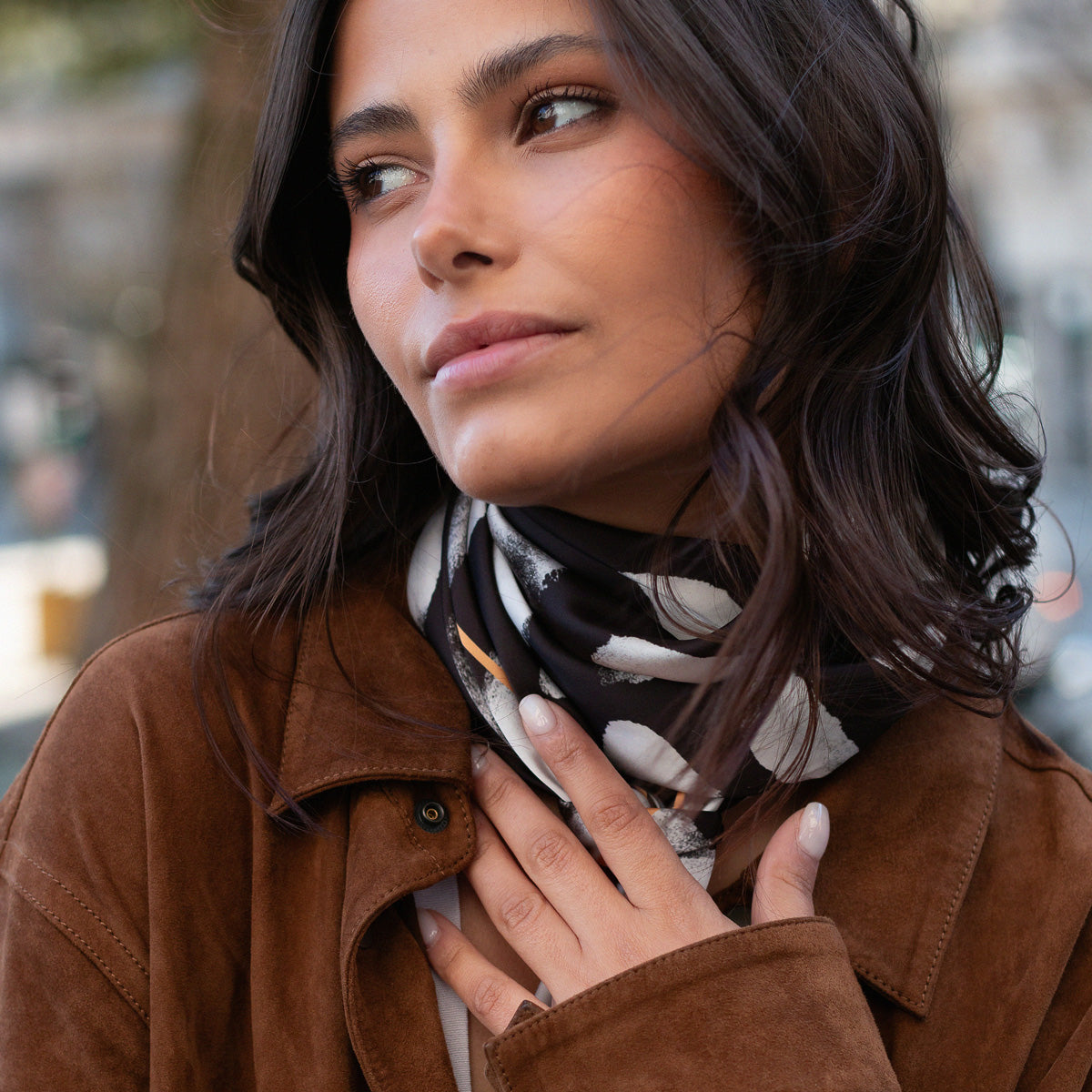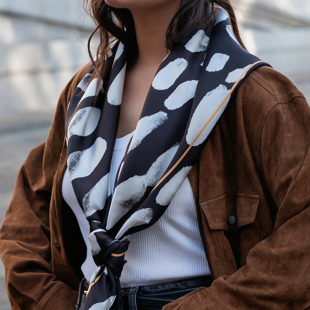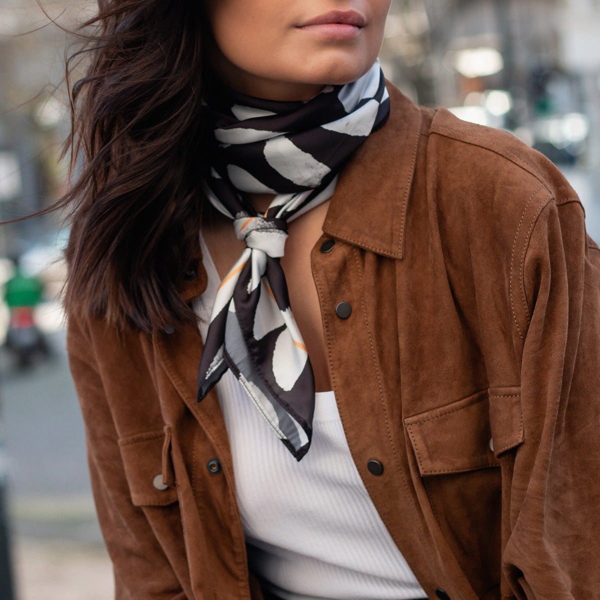 Lenço quadrado de 110 x 110 cm com acabamento em cetim.