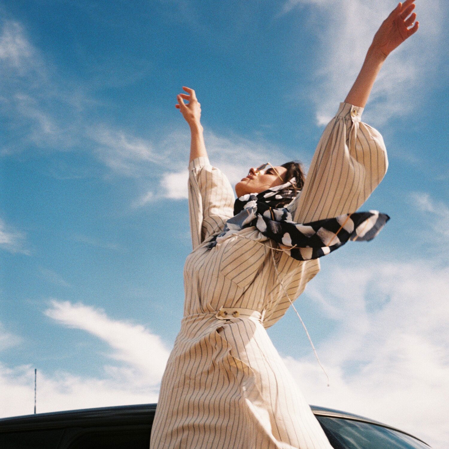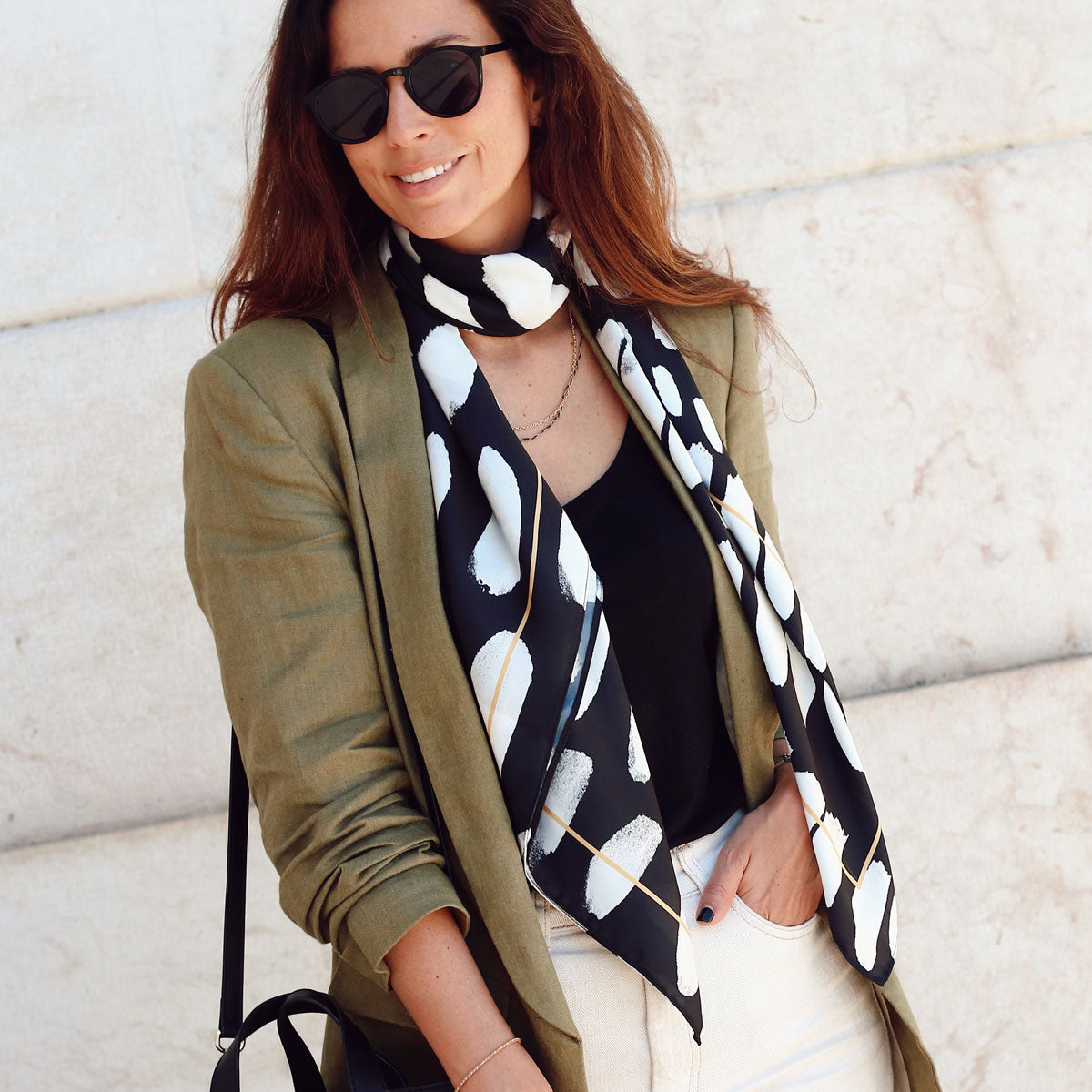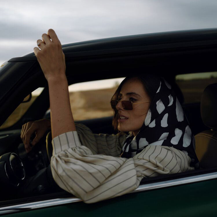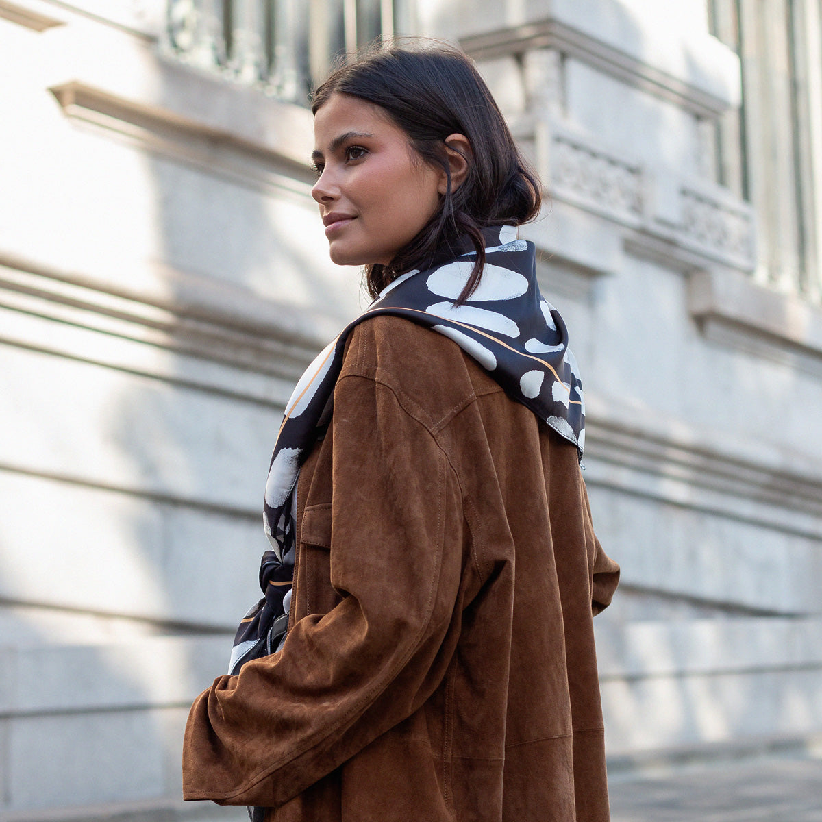 Lenço quadrado de 110 x 110 cm com acabamento em cetim.