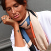 Lenço quadrado de 110 x 110 cm com acabamento em cetim.