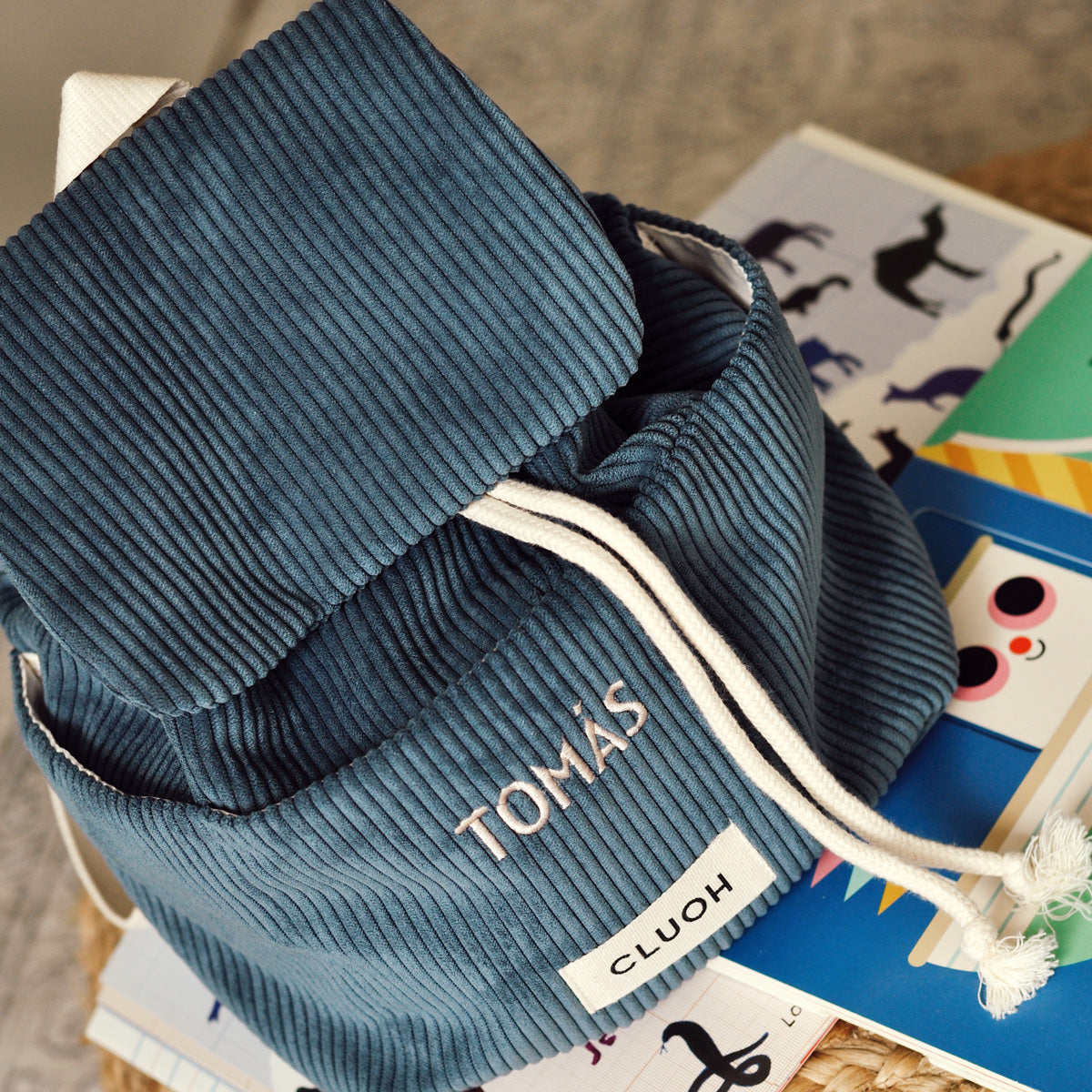 Mochila em bombazine para criança com forro e alças ajustáveis.