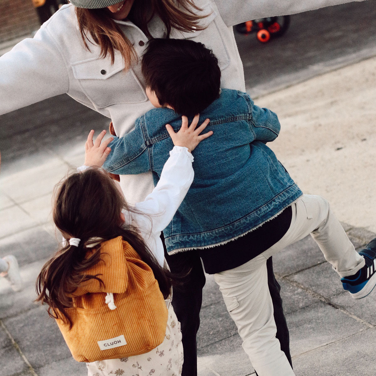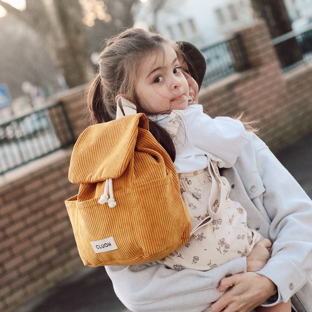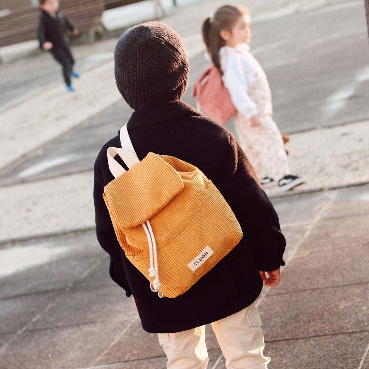 Mochila em bombazine para criança com forro e alças ajustáveis.