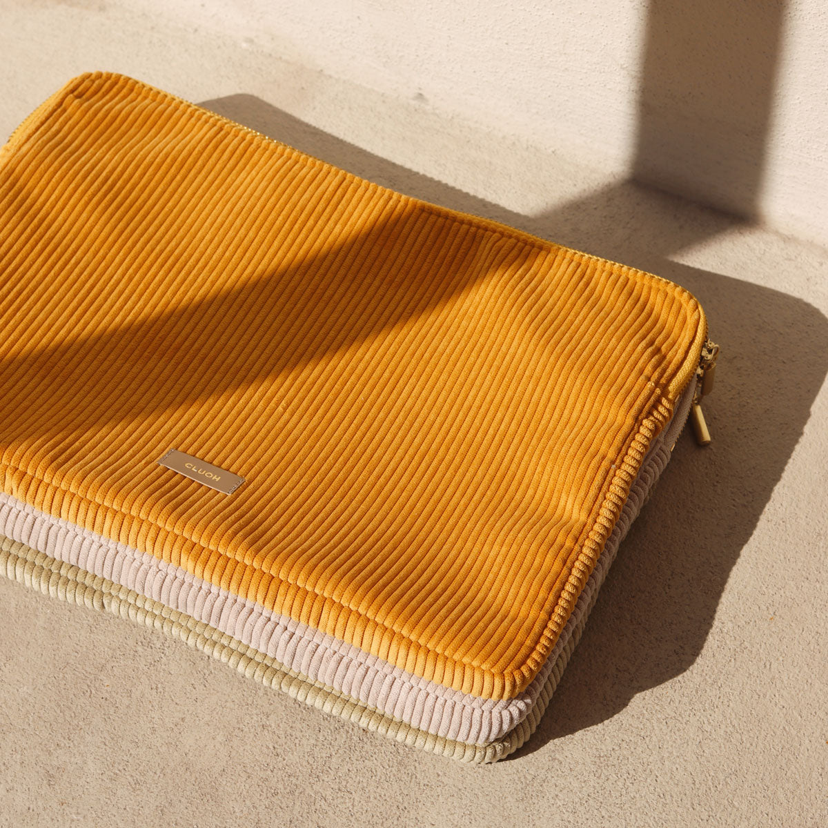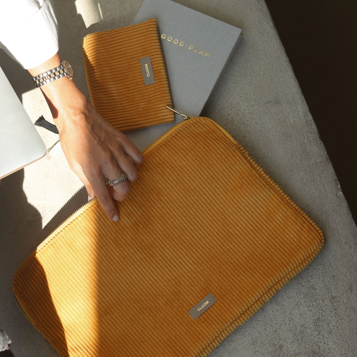 Fecho com acabamento metálico e etiqueta em pele com cunho dourado.