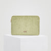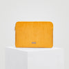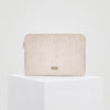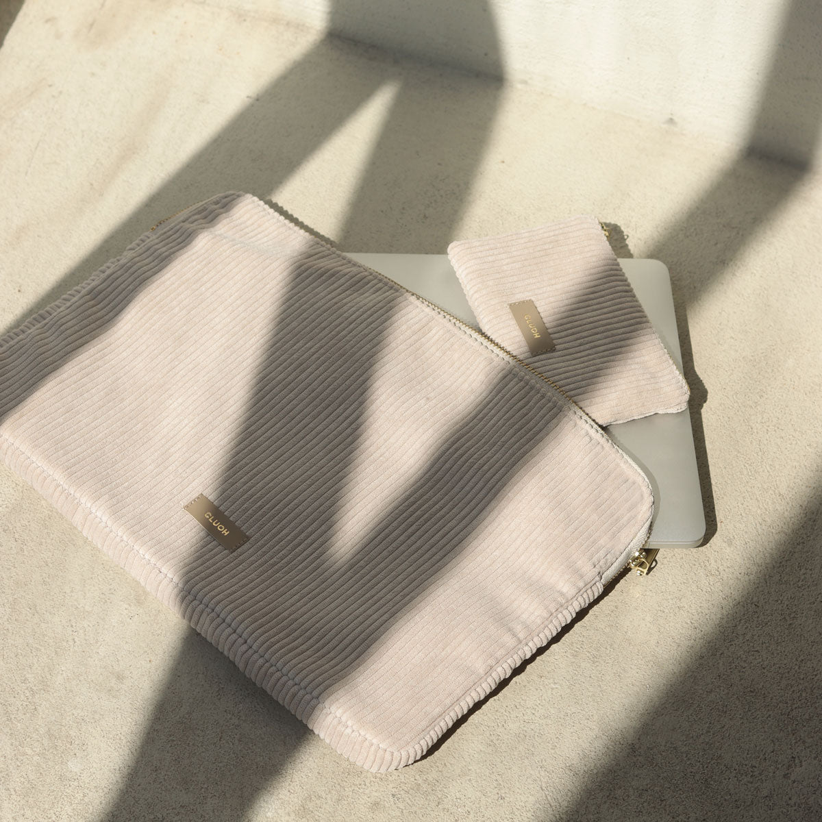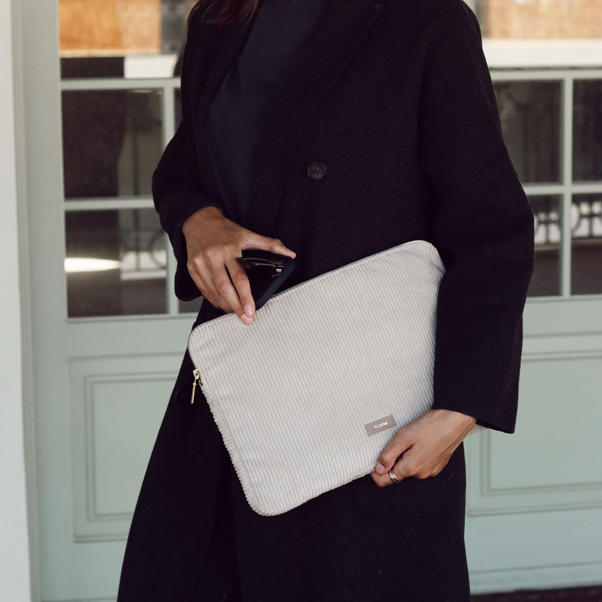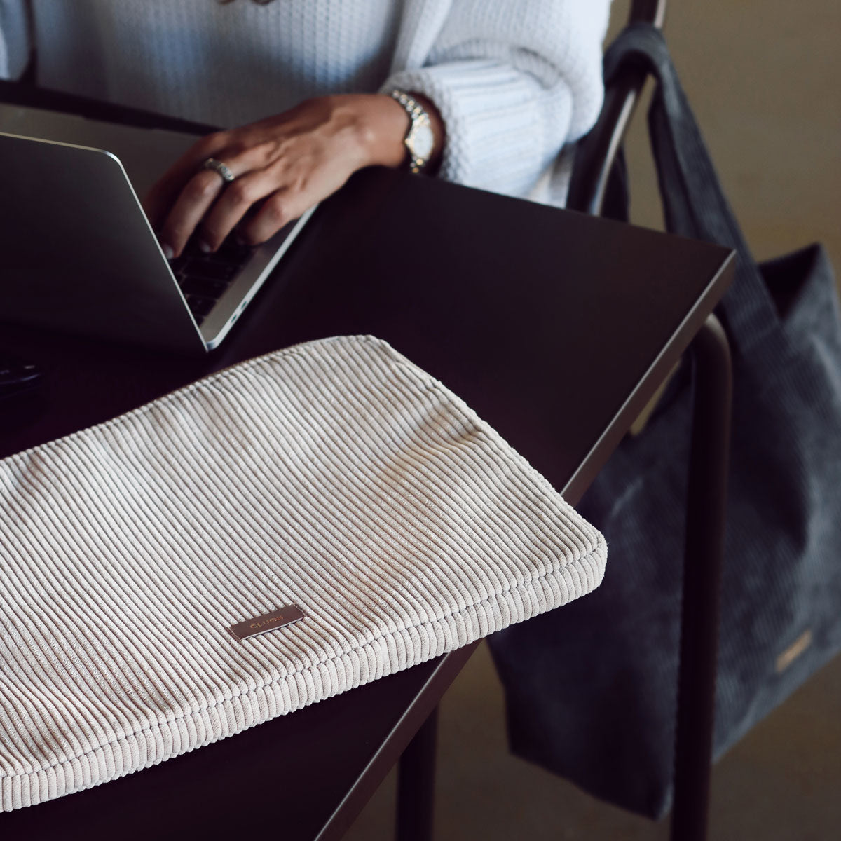 Fecho com acabamento metálico e etiqueta em pele com cunho dourado.