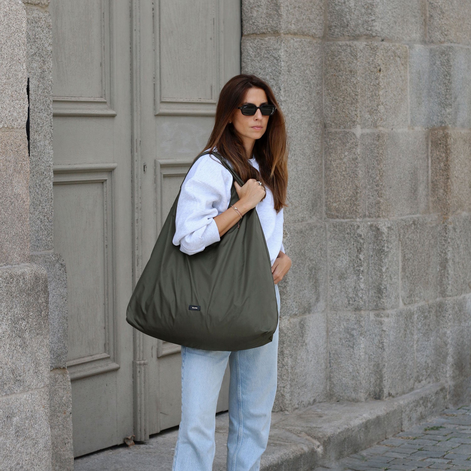 Saco XL em nylon impermeável. Este saco garante resistência e proteção mesmo nos dias de chuva. Possui fecho magnético que oferece praticidade para abrir e fechar, e tem dois bolsos para que consiga manter tudo organizado.