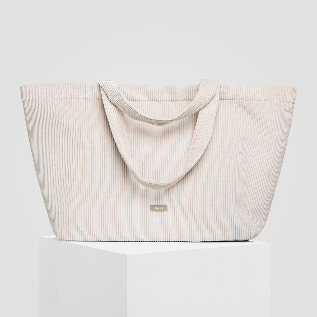 Fecho com acabamento metálico e etiqueta em pele com cunho dourado.