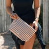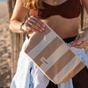 Bolsa de praia em tecido com forro impermeável.