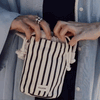Mini mala em tecido com sistema de fecho em cordão e alça tiracolo.